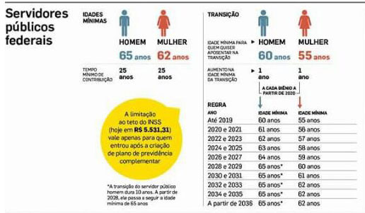 Pela proposta, serão combinados dois novos parâmetros para se aposentar: idade mínima e tempo de contribuição. Após a promulgação do relatório final da PEC, as regras para servidores federais podem ser aplicadas aos servidores estaduais, caso os Estados e municípios não consigam passar suas reformas em seus respectivos legislativos no período de seis meses.
